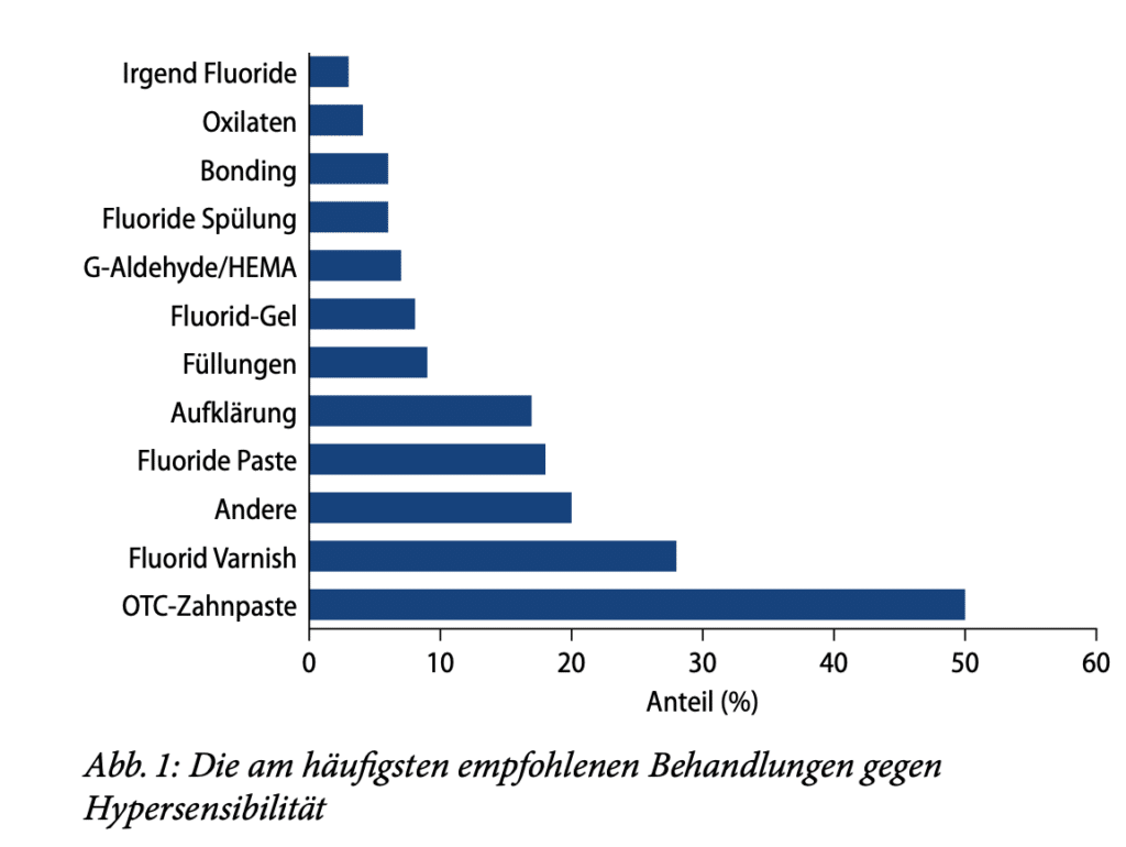 Es gibt verschiedene Ursachen von Dentinhypersensibilität. Die bekanntesten sind Karies, Erosion, Abrasion, Abfraktion, Parodontitis, Molaren-Inzisiven-Hypomineralisation und Bleaching. Diagnose und Behandlung der Dentinhypersensibilität sind aufgrund deren multifaktorieller und gelegentlich multiätiologischer Natur komplex. Eine große Herausforderung in der Behandlung ist die Subjektivität der individuellen Schmerzwahrnehmung. Auch das Vorhandensein von Störfaktoren wie Ernährung, Hygiene, Rauchen und parafunktionellen Gewohnheiten sowie die Gesundheit der Pulpa und des Parodonts können die Diagnostik und Behandlung der Dentinhypersensibilität erschweren [16]. Die therapeutischen Modalitäten können in zwei unterschiedliche Ansätze zur Behandlung offener Dentintubuli unterteilt werden. Bei der ersten Modalität handelt es sich um lokale oder systemische Behandlungen, die darauf abzielen, die eigentlichen Schmerzsymptome zu beruhigen oder zu lindern. Die zweite Modalität ist ein mechanischer Ansatz, bei dem die Tubuli abgedichtet werden sollen. Der mechanische Ansatz kann weiter unterteilt werden nach dem Einsatz rein mechanischer Blockiermittel (Lacke und Versiegelungen) oder solcher Mittel, die die Remineralisierung und/oder das Verstopfen der Tubuli fördern, eine weitere Demineralisierung verhindern oder tatsächlich Mineralien im Tubulus ablagern sollen. Betäubende Mittel können sowohl bei der anfänglichen mechanischen Verstopfung als auch beim langfristigen Remineralisierungsprozess eine Rolle spielen. Die häufigste medikamentöse Behandlung ist die Zugabe von 5 % Kaliumnitrat oder Kaliumcitrat zu Zahnpasta. Beide Substanzen zeigten eine klinische Wirksamkeit, wenngleich die Wirkungen unterschiedlich ausfielen. Kalziumprodukte werden seit Jahrzehnten empfohlen, wobei Analysen von In-vitro-Daten eine Verengung der Tubuli bei Behandlung mit Kalziumhydroxid belegen. Anfang der 1990er-Jahre wurde ein Produkt auf der Basis von amorphem Kalziumphosphat (ACP) in den Handel gebracht. Das Zahnputzmittel enthielt Natriumfluorid, Kalziumsalze und Phosphatsalze [17]. Es ist allgemein anerkannt, dass Speichel mehrere Funktionen bei der Verhinderung der Demineralisierung und sogar bei der Förderung der Remineralisierung hat. Zu diesen Funktionen gehören die Pufferung von Säuren mithilfe von Bikarbonat, Speichelproteinen und Kalziumphosphat sowie die Verdünnung und Beseitigung erosiver Wirkstoffe. Eine Verbesserung der Speichelfunktion könnte also auch ein Behandlungsansatz sein. Die lokale Applikation von Kaliumnitrat vor und nach Bleaching kann laut einer Studie die Hypersensibilität verringern [18]. Die Zahnaufhellung wurde durch die lokale Applikation nicht beeinflusst. Verschiedene Behandlungsmodalitäten werden in der klinischen Routine von Zahnärzten direkt angewendet oder für den Heimgebrauch verschrieben, mit unterschiedlichem Wirksamkeitsgrad. Etwa 50 % der Zahnarztpraxen berichten von einem Mangel an Vertrauen der Patienten in die Behandlung der Dentinhypersensibilität-bedingten Schmerzen. Viele Zahnärzte empfehlen eine Reihe unterschiedlicher Modalitäten für die Behandlung von DH in der Praxis. Einige Zahnärzte empfehlen eine einzelne Behandlungsmethode, andere empfehlen eine Kombination von Behandlungen. Die von den Zahnärzten am häufigsten empfohlene Behandlung ist die Verwendung einer rezeptfreien („over the counter“ [OTC]) desensibilisierenden Kaliumnitrat-Zahnpasta, allein oder in Kombination mit anderen Behandlungen. Dieses Regime wird bei ca. 50 % der Patienten empfohlen, gefolgt von der Anwendung von Fluoridlack (28 %) und einer Behandlung, die als „andere“ kategorisiert wurde, einschließlich desensibilisierender OTC-Streifen bei 21 % der Patienten mit Dentinhypersensibilität. Die Verschreibung von Fluoridzahnpasta wird bei 17 % empfohlen. 8 % der Patienten wird eine restaurative Behandlung nahegelegt. Zusammenfassend kann man sagen, dass desensibilisierende rezeptfreie Kaliumnitrat-Zahnpasta und Fluoridprodukte zurzeit die am häufigsten empfohlenen Produkte zur Behandlung von Dentinhypersensibilität in der Praxis sind (Abb. 1). Beispiele für beliebte Desensibilisierungsmittel in Form von Fluoridlacken sind Provanish (VOCO) und Duraphat (CP GABA). Andere In-Office-Desensibilisatoren sind GLUMA-Produkte (Heraeus Kulzer), Sensodyne MultiCare Zahnpasta (GlaxoSmithKline/Hale-on), Elmex Sensitive Professional (CP GABA), MI Paste (GC)und Bifluorid (VOCO) [19, 20, 21]. Durch eine Metaanalyse konnte ein alternativer Therapieansatz gestärkt werden: Der Einsatz eines Low-power-Lasers in der Therapie von Dentinhypersensibilität führte dazu, dass die von Patienten berichteten durchschnittlichen Schmerzen nach 3-monatiger Nachbeobachtungszeit im Vergleich zu den durchschnittlichen Schmerzen vor der Behandlung mit der Lasertherapie geringer waren. Die Verbesserung der Lasertechnologie hat dazu geführt, dass die Lasertherapie als neue Behandlungsalternative für Dentinhypersensibilität in Erwägung gezogen werden kann [22]. Wichtig bei diesem Therapieansatz sind die vorausgehende Anamnese und Diagnose sowie die Präferenzen der Praxis.