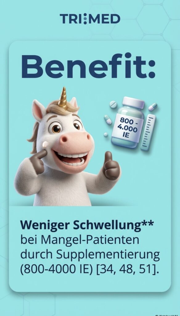 Liegt ein gesicherter Mangel vor, kann eine präoperative Supplementierung erwogen werden. Ziel ist die Reduktion postoperativer Entzündungsreaktionen und Schwellungen sowie die Unterstützung des Kieferknochenstoffwechsels. Dabei gilt: Supplementierung setzt ein Monitoring voraus. Folgemessungen sind erforderlich, um den Verlauf des Spiegels unter Therapie zu kontrollieren – denn auch die Kehrseite ist leitlinienrelevant.