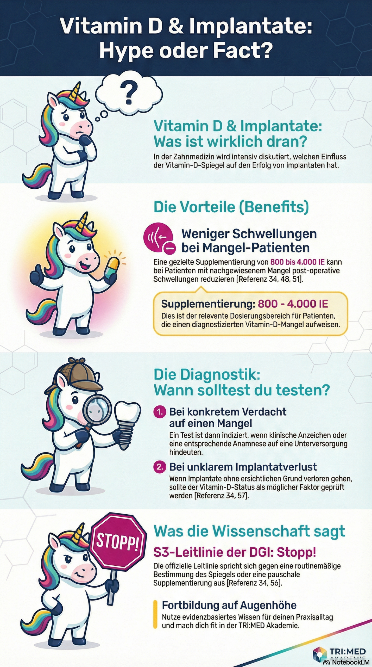 Liegt ein gesicherter Mangel vor, kann eine präoperative Supplementierung erwogen werden. Ziel ist die Reduktion postoperativer Entzündungsreaktionen und Schwellungen sowie die Unterstützung des Kieferknochenstoffwechsels. Dabei gilt: Supplementierung setzt ein Monitoring voraus. Folgemessungen sind erforderlich, um den Verlauf des Spiegels unter Therapie zu kontrollieren – denn auch die Kehrseite ist leitlinienrelevant.